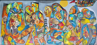 A cubist-inspired composition by SRJ (Surajit Chakraborty), rendered in acrylic on canvas, where intertwined figures and fractured blocks of colour convey intimacy, tension, and collective human presence within a compressed urban space.