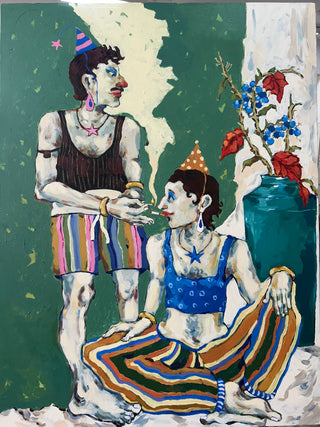 Tushar Tanwar captures the raw tenderness and bold defiance of queer intimacy, where desire becomes a shared ritual. Through eccentric colours, playful patterns, and exaggerated forms, the painting celebrates love in all its chaos, madness, and clarity.