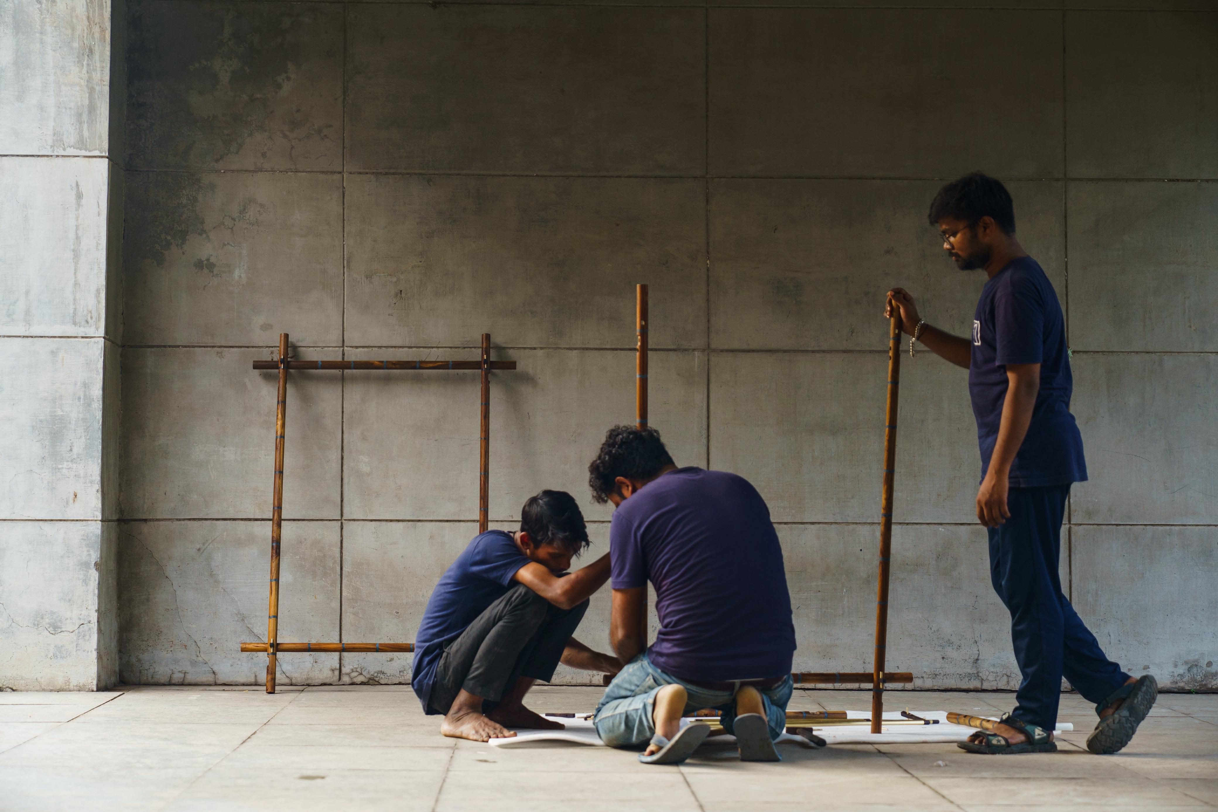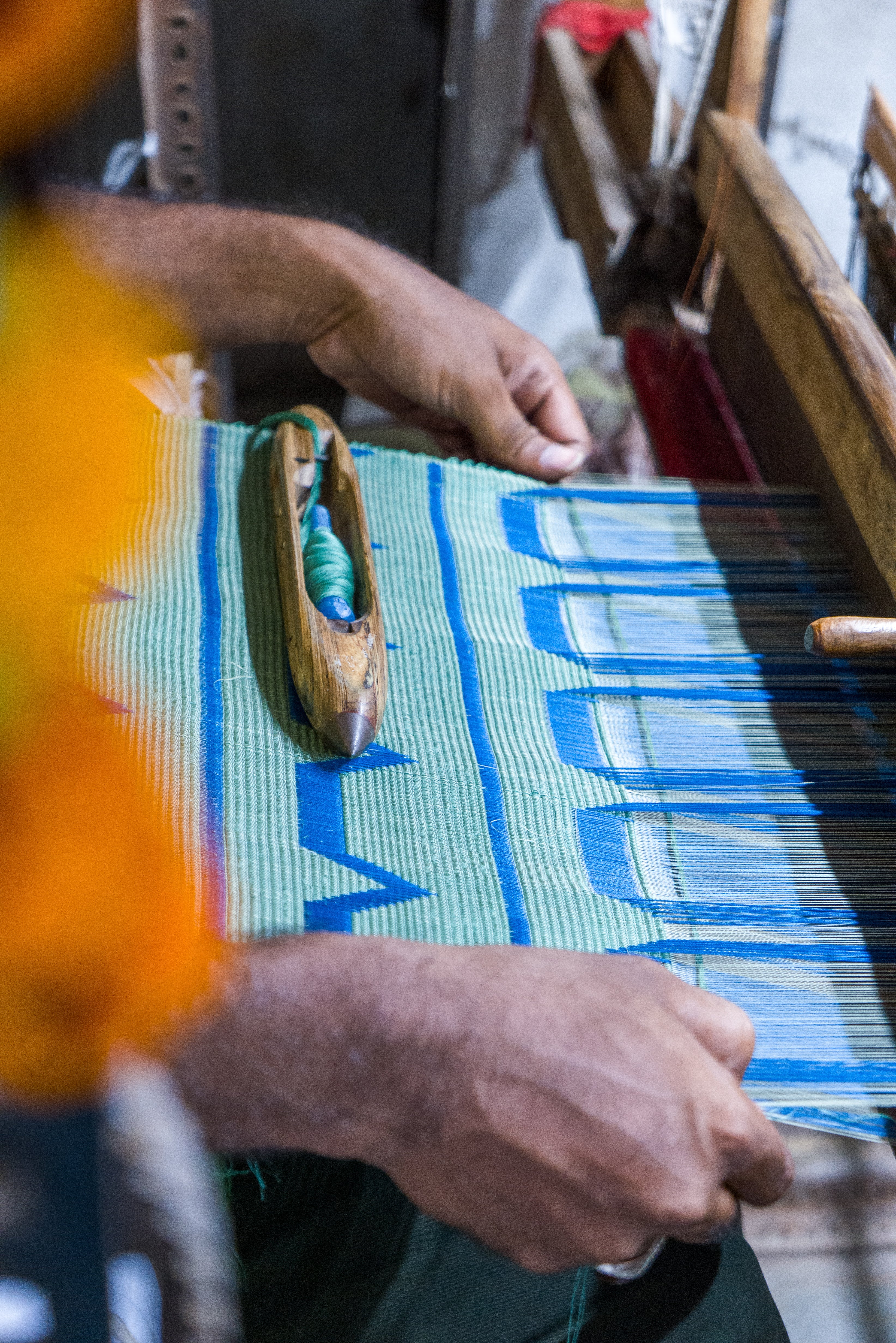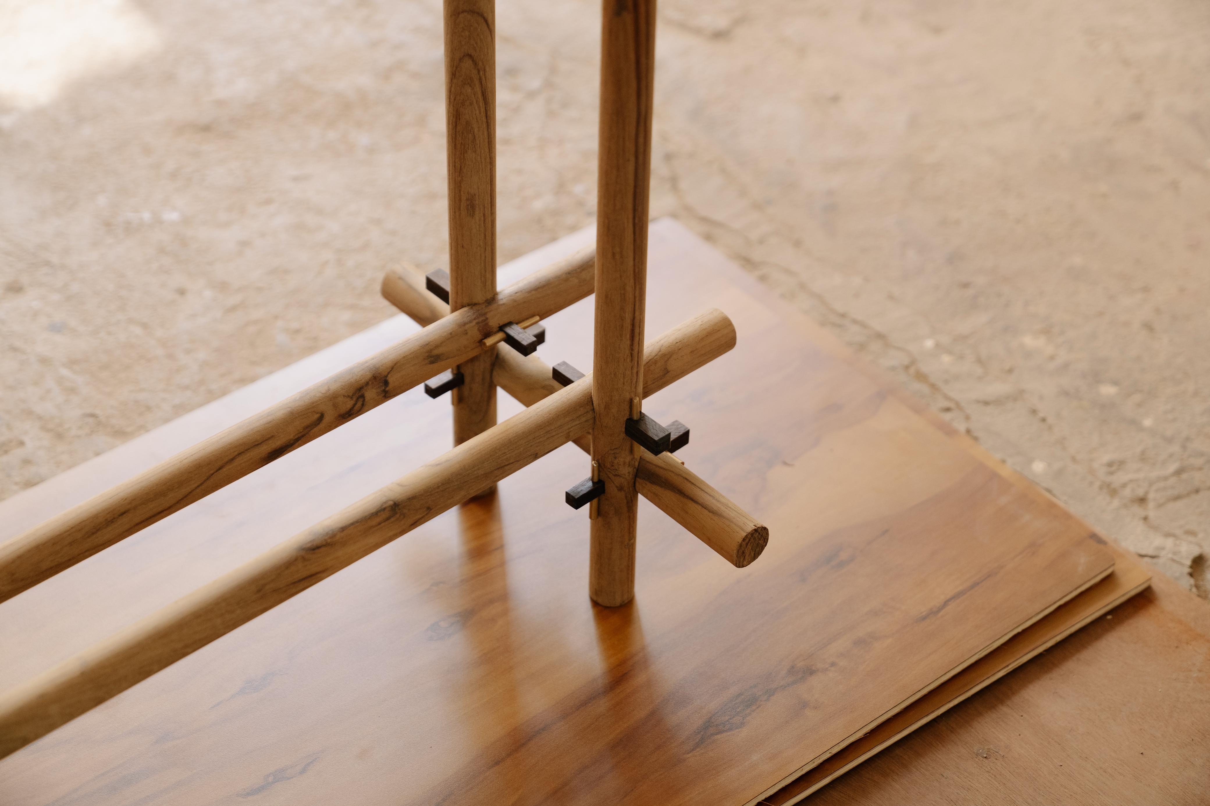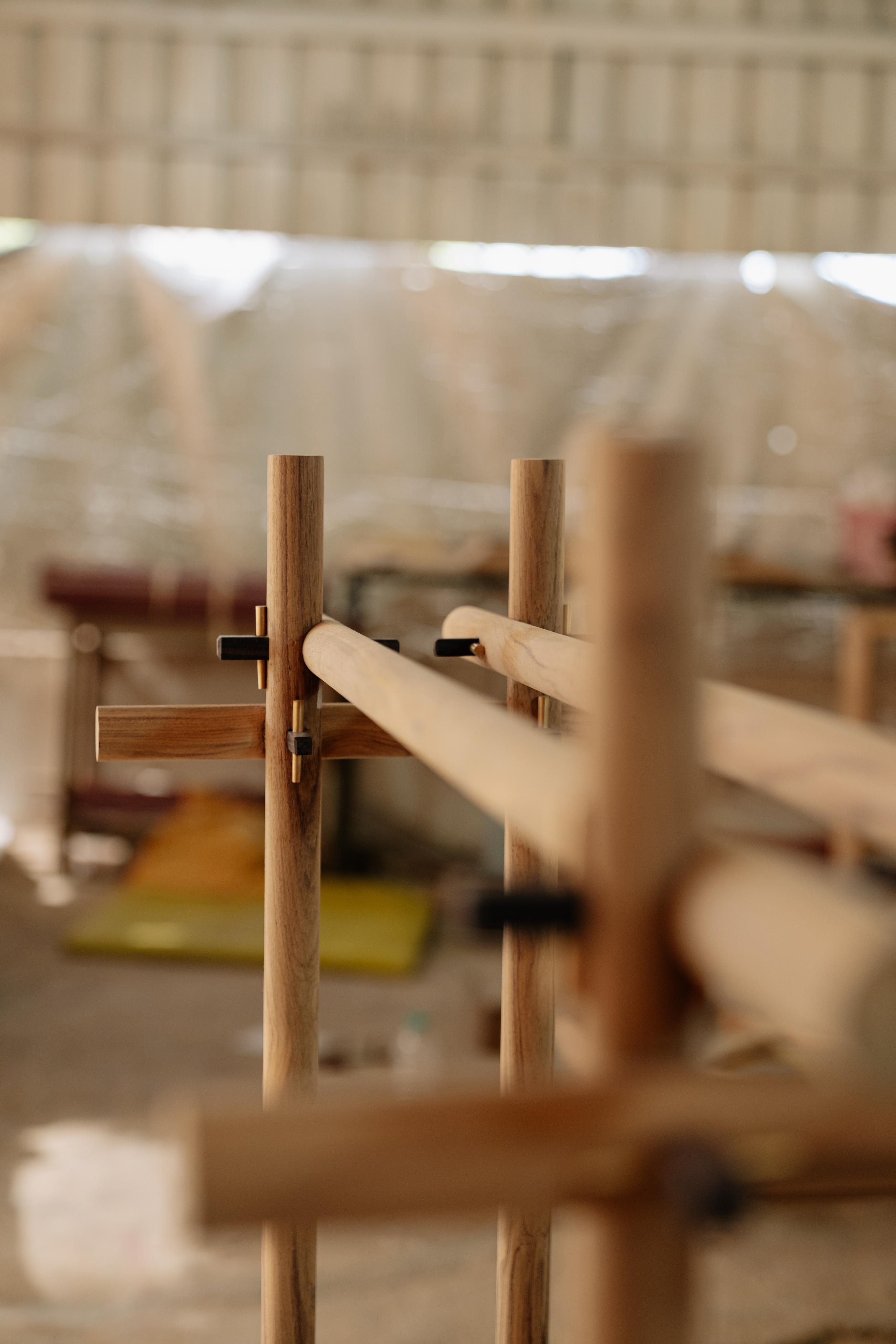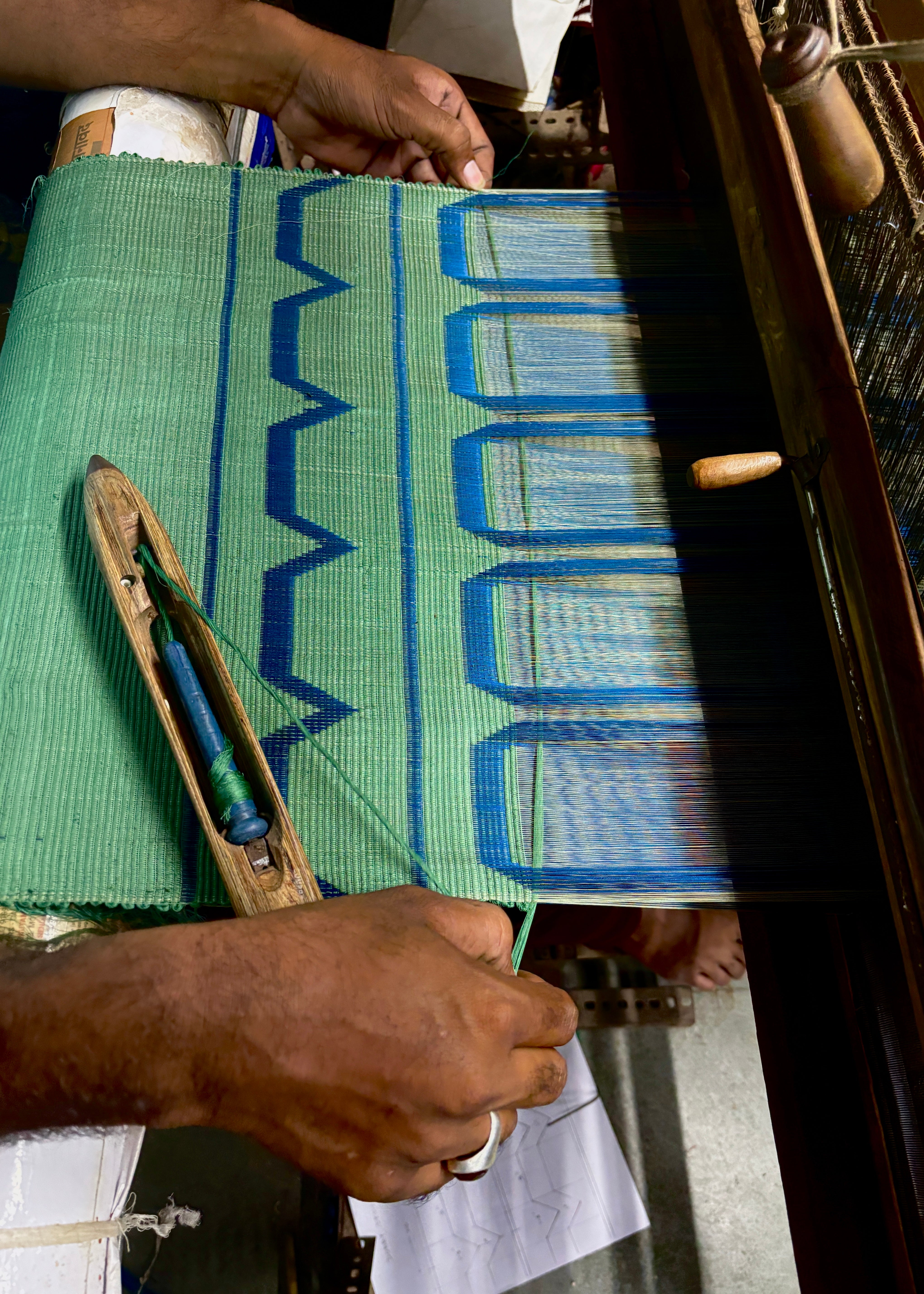 Inspired by the Art Deco buildings around Mumbai’s Oval Maidan, this piece draws on geometric patterns, wave motifs, and streamlined forms that suggest movement and modernity. Amba’s woven textile captures these elements, translating architecture into thread. A custom wooden structure by SHED holds the textile lightly, evoking the provisional nature of scaffolding—structures that signal transition and make space for what is underway. Freestanding and open on all sides, it is conceived as a spatial installation rather than a framed work, echoing the architectural observations from which it draws.