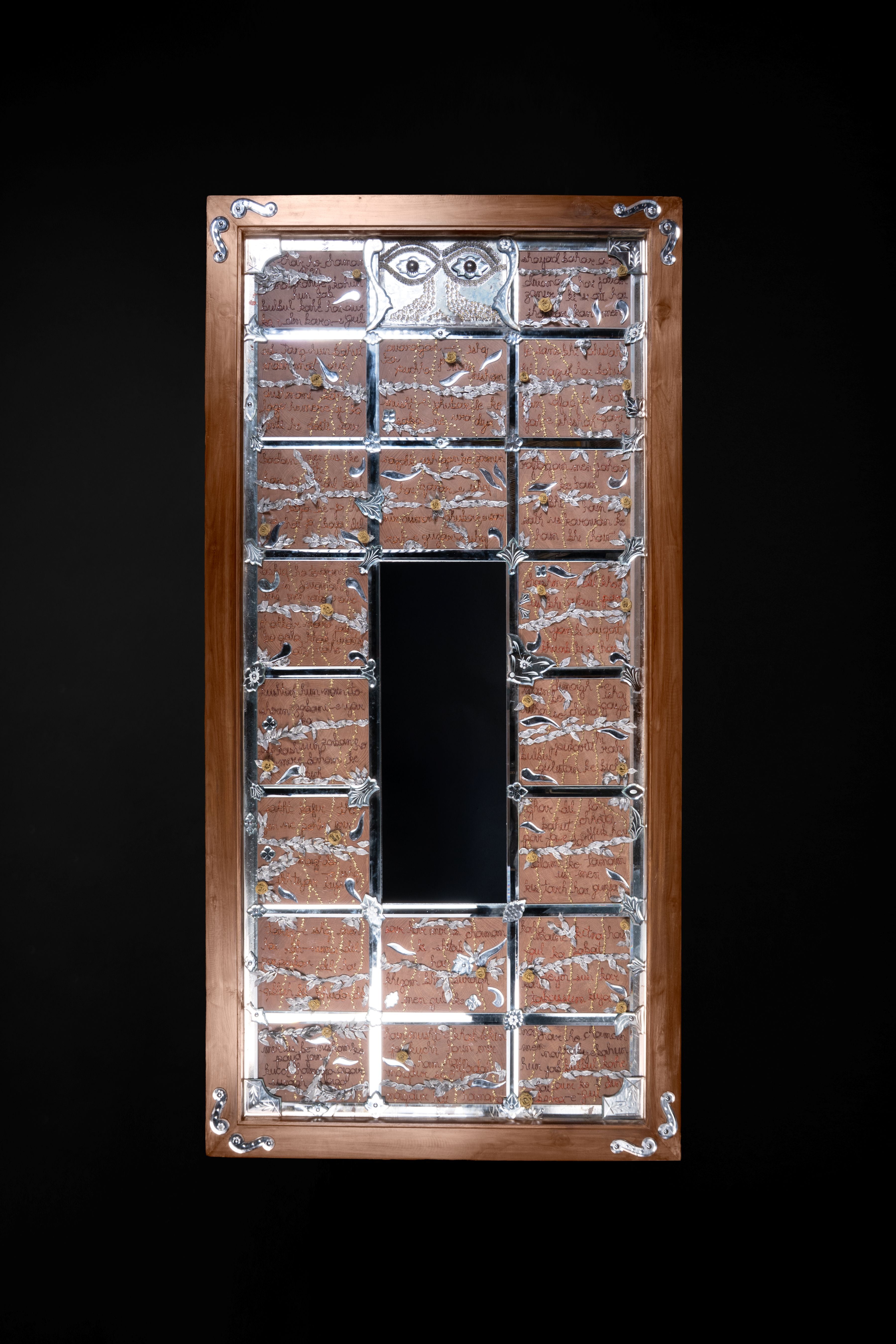 Medium/ Materials: Post industrial metal scrap, burnt copper wires, old mirrors, scrap brass jewelry, wooden frame and resin.