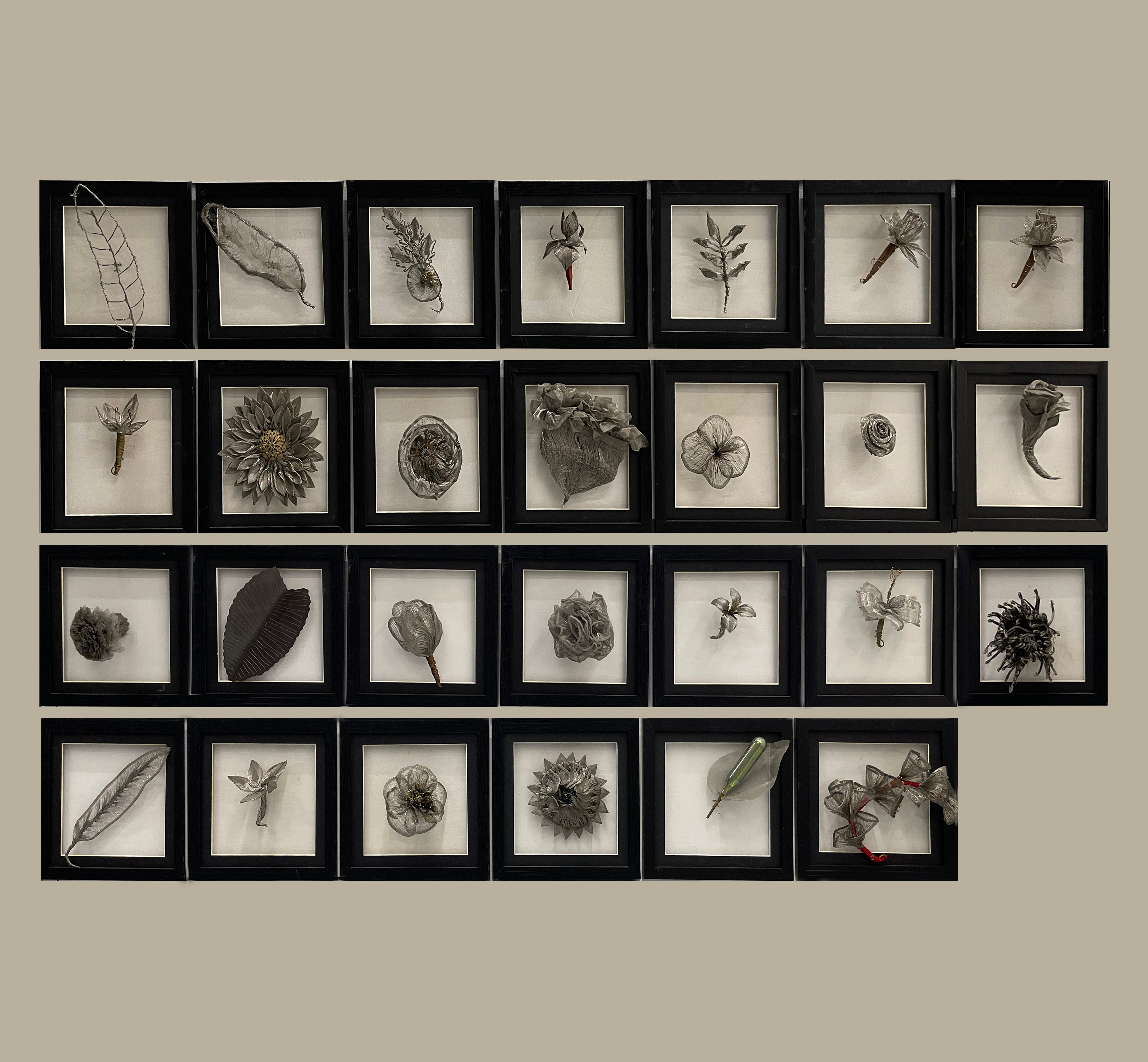Medium/ Materials: Scrap metal, brass and copper wires framed in acrylic