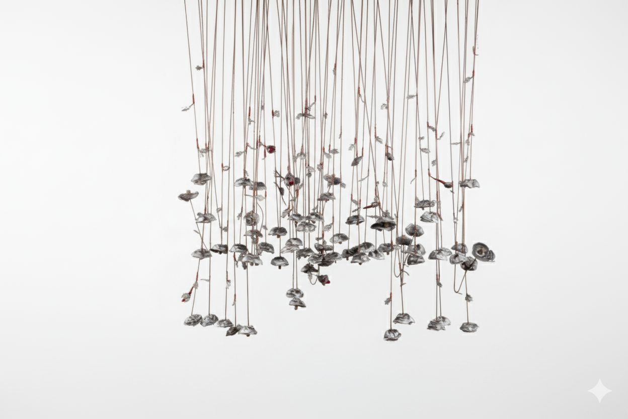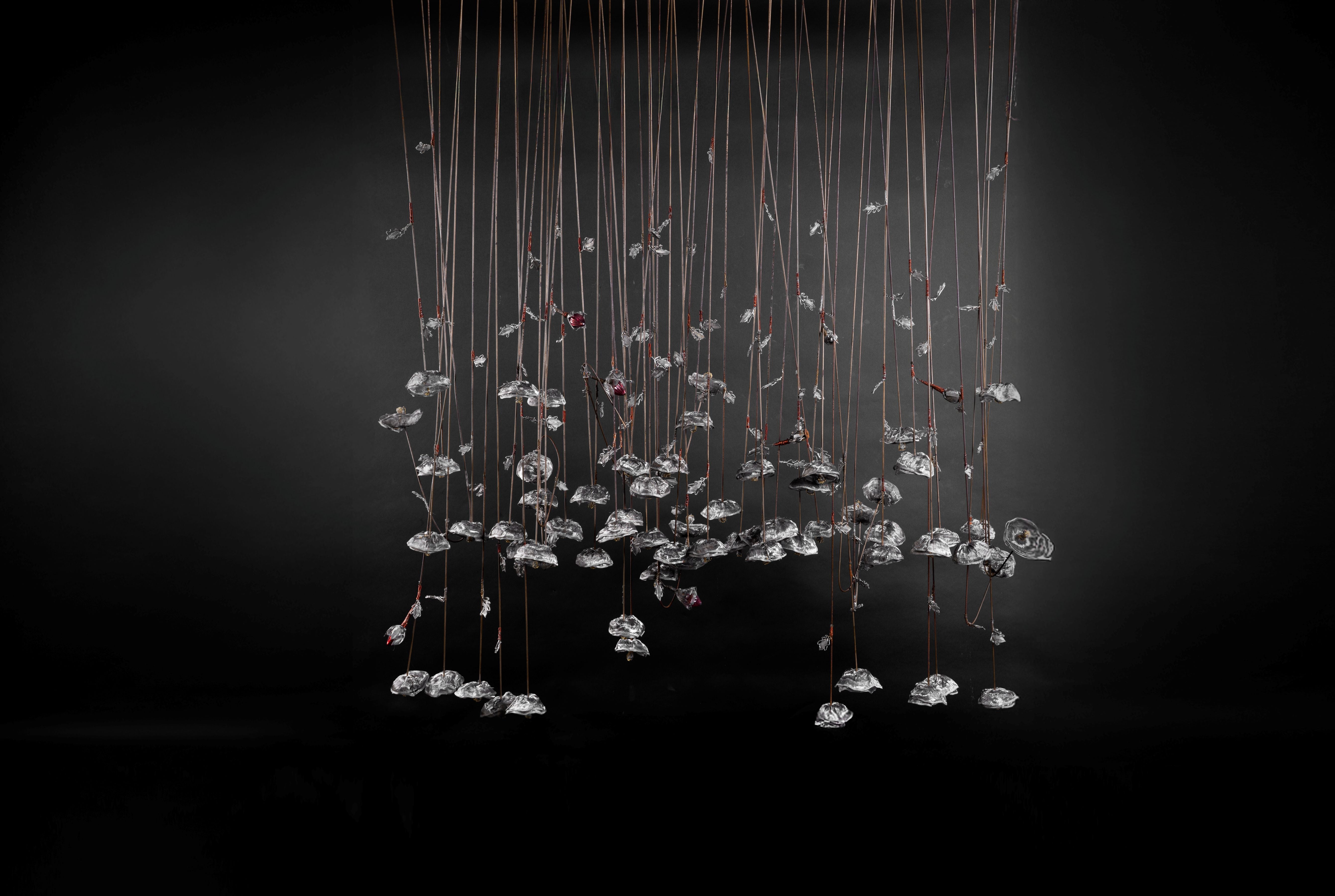 Medium/ Materials: Scrap metal flowers, glass baubles, sewing machine bobbins, copper wires, brass wires, scrap metal trays, metal mesh and chandelier glass.