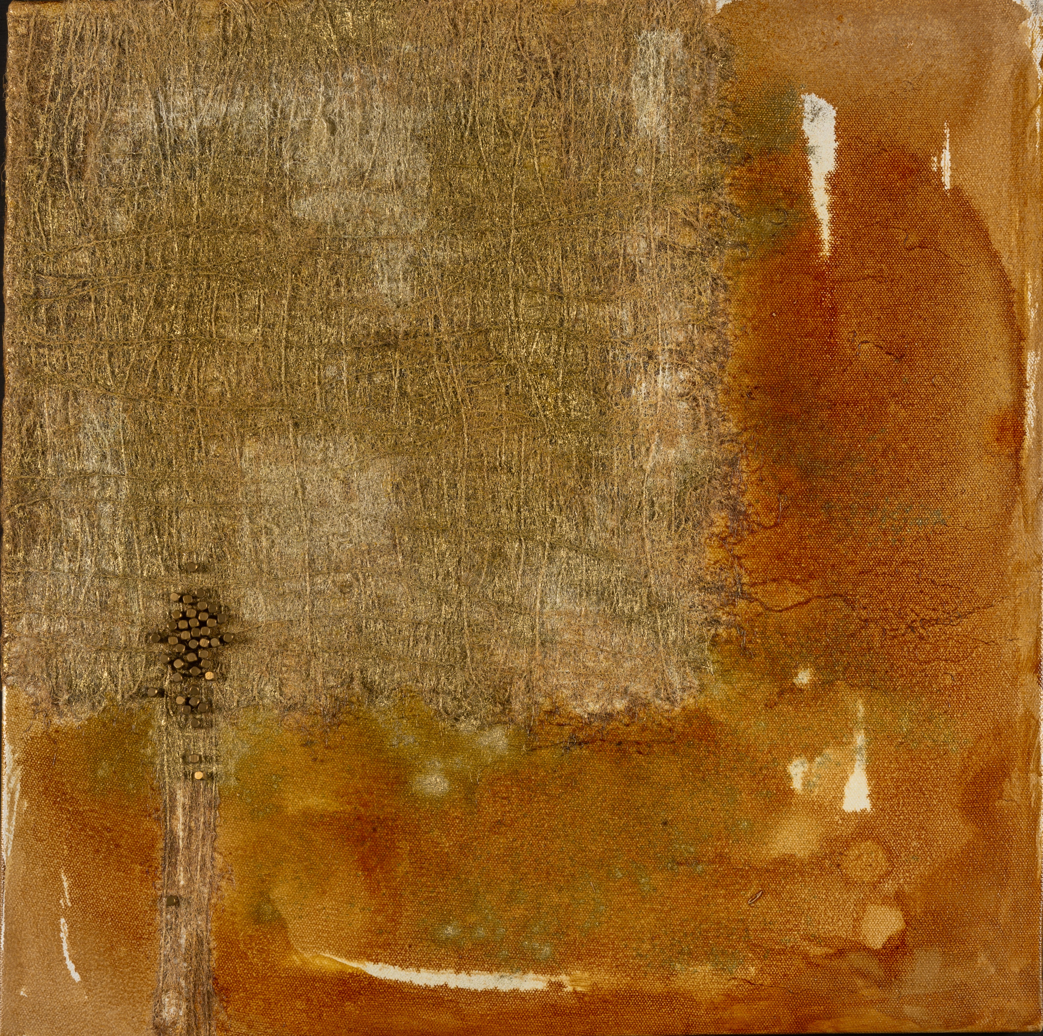 The artwork features an intense application of yellow oak wood polish and gold powder, emphasizing the inner self's value and the need for nurturing. A random flow of ink is introduced, allowing the base canvas to peek through, illustrating the rapid ebb and flow of emotions and the control one can exert over them. In addition, a sprinkling of metal dots is introduced, symbolizing the indulgence of self-acceptance and marking a directional path toward self-awareness.