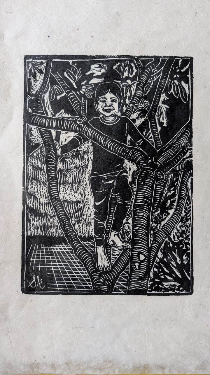 Medium: Linocut on handmade Nepalese Lokta paper with Caligo inks.