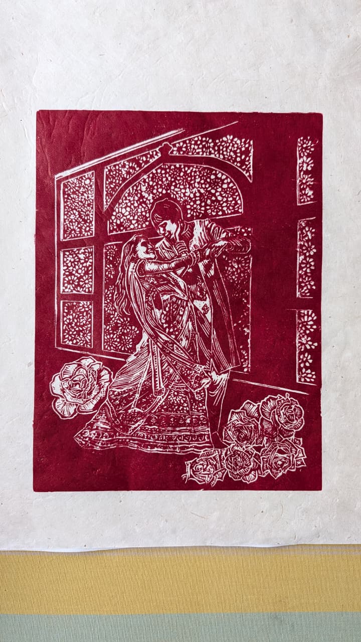 Medium: Linocut on handmade Nepalese Lokta paper with Caligo inks.
